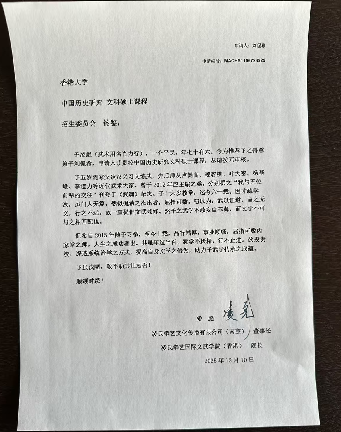 申请材料里,推荐信和个人陈述最为关键。儿子叮嘱我,推荐信要兼顾实践与学术。我有幸请到肖力行老师执笔,肖师以半文言文写就,言简意赅,立意高远,在一众材料中定然与众不同。学术方面,有王辉博士与香港科技大学家办研究中心主任彭倩教授相助;香港的实践经历,则由盛敏莉副会长鼎力背书。