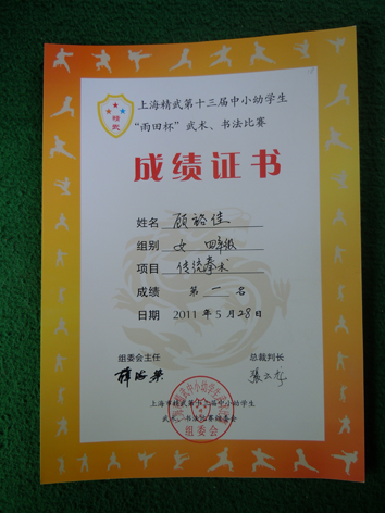 顾裕佳同学(女)传统武术第一名,金牌。