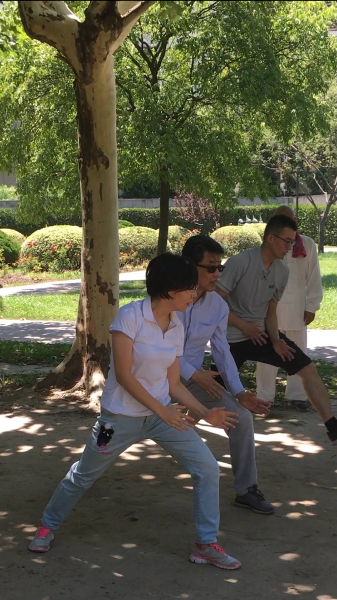 小凌老师照例先带我们打了一套水浪拳,灵石公园的这块训练地总是让我在打拳时感到心神特别的安定。今日我跟着师父打水浪拳,不知不觉完全沉浸到了师父引导的气场中,仿佛整个时空都凝固了。的确,这真是块练拳的风水宝地。小凌老师挑遍真个公园精心选择的,东、南开阔;西、北有靠,最适合练拳。而且,这里从我第一天学拳开始,有着太多我跟随师父学拳的记忆了,师父的定力始终夹持着我,让我也逐渐进入到神定的境界。